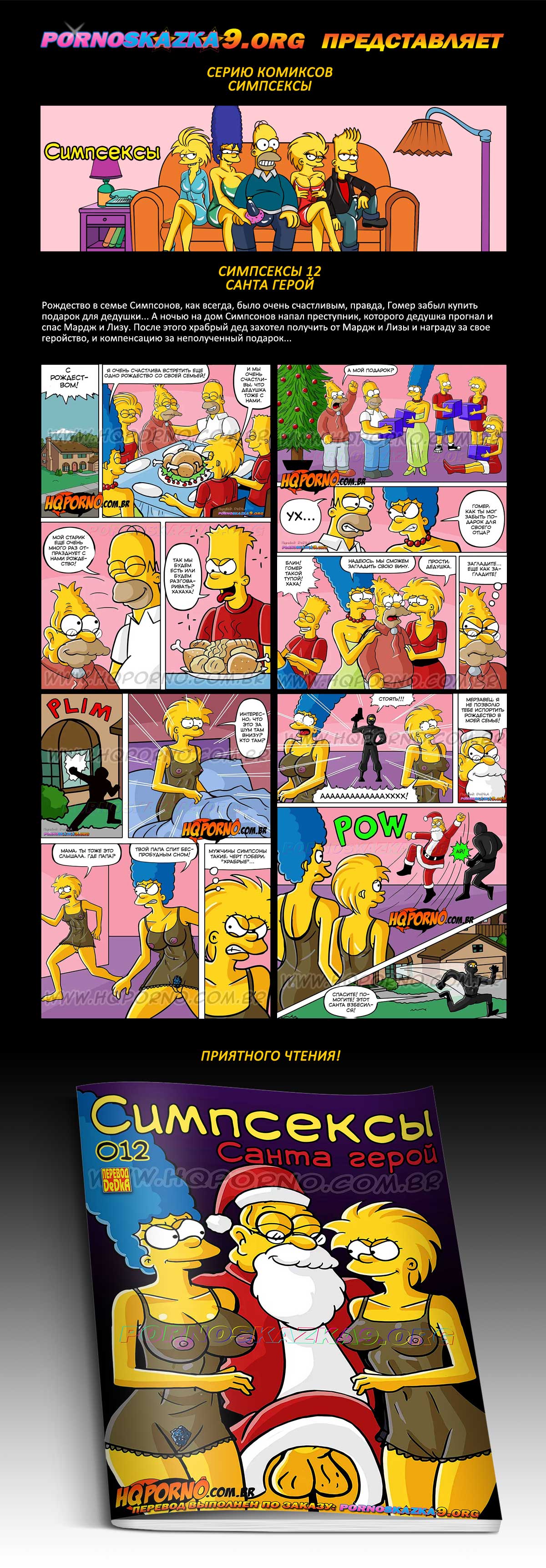 Порно комикс Симпсексы. Часть 12: Санта герой. Рождество в семье Симпсонов, как всегда, было очень счастливым, правда, Гомер забыл купить подарок для дедушки… А ночью на дом Симпсонов напал преступник, которого дедушка прогнал и спас Мардж и Лизу. После этого храбрый дед захотел получить от Мардж и Лизы и награду за свое геройство, и компенсацию за неполученный подарок…